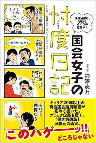 『国会女子の忖度日記:議員秘書は、今日もイバラの道をゆく』 あの自民党女性議員の「このハゲーーッ!!」どころじゃない。ブラック企業も驚く労働環境にいる国会議員秘書の叫びを聞いて下さい。議員の傲慢、セクハラ、後援者の仰天陳情、議員のスキャンダル潰し、命懸けの選挙の裏、お局秘書のイジメ……知られざる仕事内容から苦境の数々まで20年以上永田町で働く現役女性政策秘書が書きました。人間関係の厳戒地帯で生き抜いてきた処世術は一般にも使えるはず。全編4コマまんが付き、辛さがよくわかります。